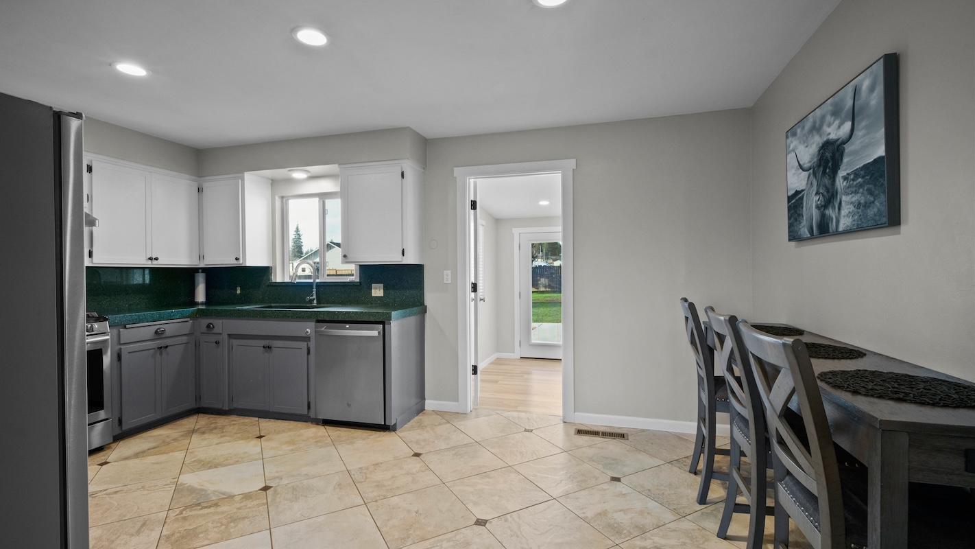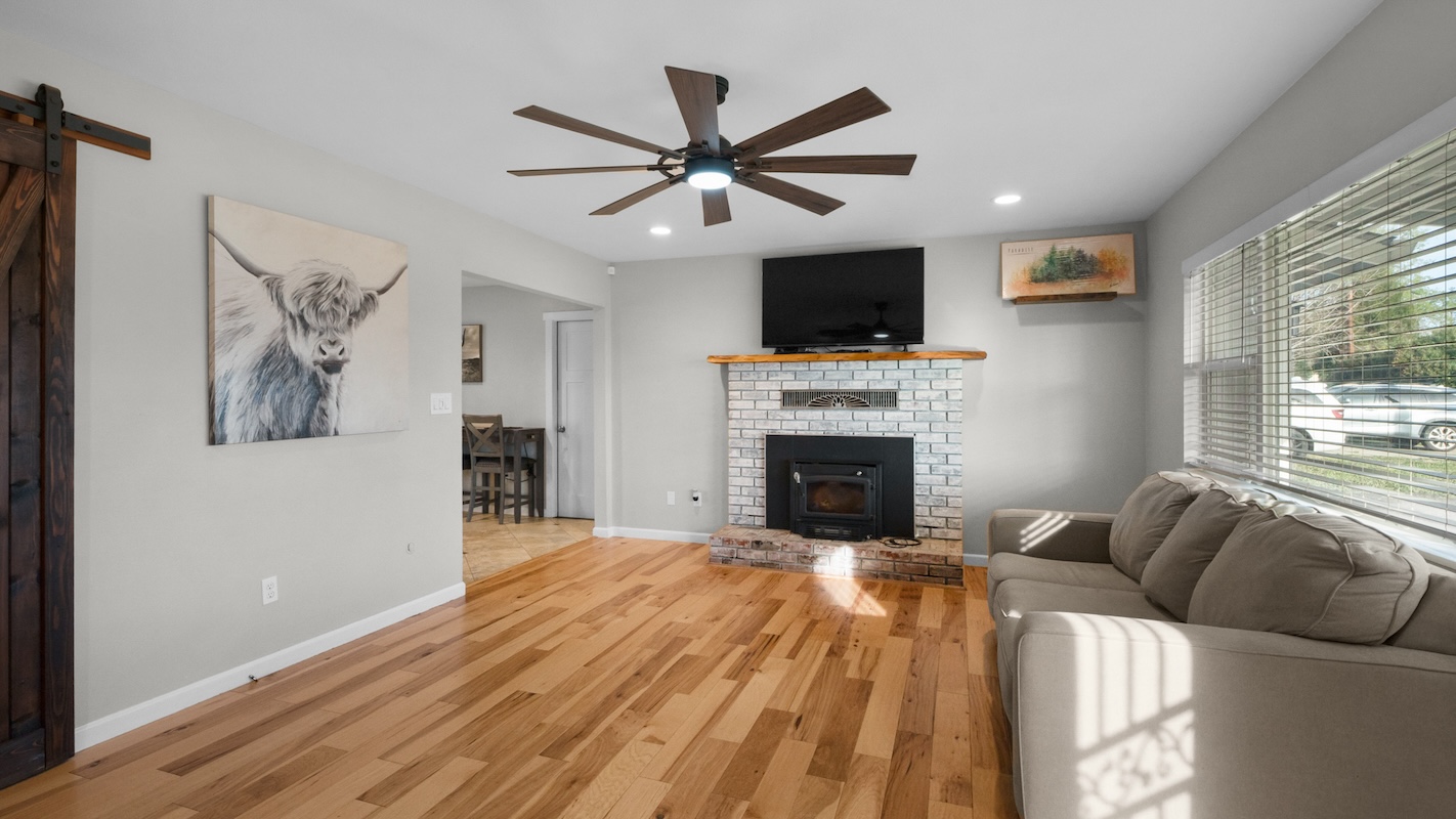 Inside, the spacious living room creates a warm and inviting gathering space centered around a cozy wood stove. The layout flows naturally into the dining area and kitchen, making the home feel connected and functional for both daily routines and casual entertaining. Stone counters, a breakfast nook, and a comfortable work triangle give the kitchen a practical feel, while a mix of wood, tile, and carpet adds texture and character throughout the home.